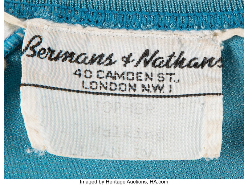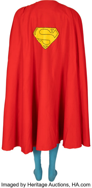 Christopher Reeve “Superman” Costume for Superman IV: The Quest for Peace (Warner Bros., 1987). Christopher Reeve is perhaps the generationally best-known actor associated with the role of Superman. Vintage original (4) piece superhero costume consisting of (1) a blue stretch-fabric body suit with “S” logo sewn and blocked inset panel at chest and integral red bikini briefs with belt loops and zipper back closure with internal “Berman & Nathan’s” bias label marked “Christopher Reeve / Walking / Superman IV,” (1) pair of matching blue leggings with internal “Berman & Nathan’s” bias label marked “Christopher Reeve / Walking / Superman IV,” (1) full-length red cape with yellow “S” logo applique patch on back, snaps at shoulders for affixing to costume, and internally marked “Christopher Reeve / Walking / Superman IV,” and (1) pair of red leather knee-boots with hidden zippers in back and with both marked internally, “C4”. Exhibiting minor age and production wear with right boot retaining gaffer’s tape marks and some piling and pulling to suit front. Overall in vintage Very Fine condition. Provenance: Profiles in History Auction 18, March 31, 2004, Lot 320. Comes with a COA from Heritage Auctions.